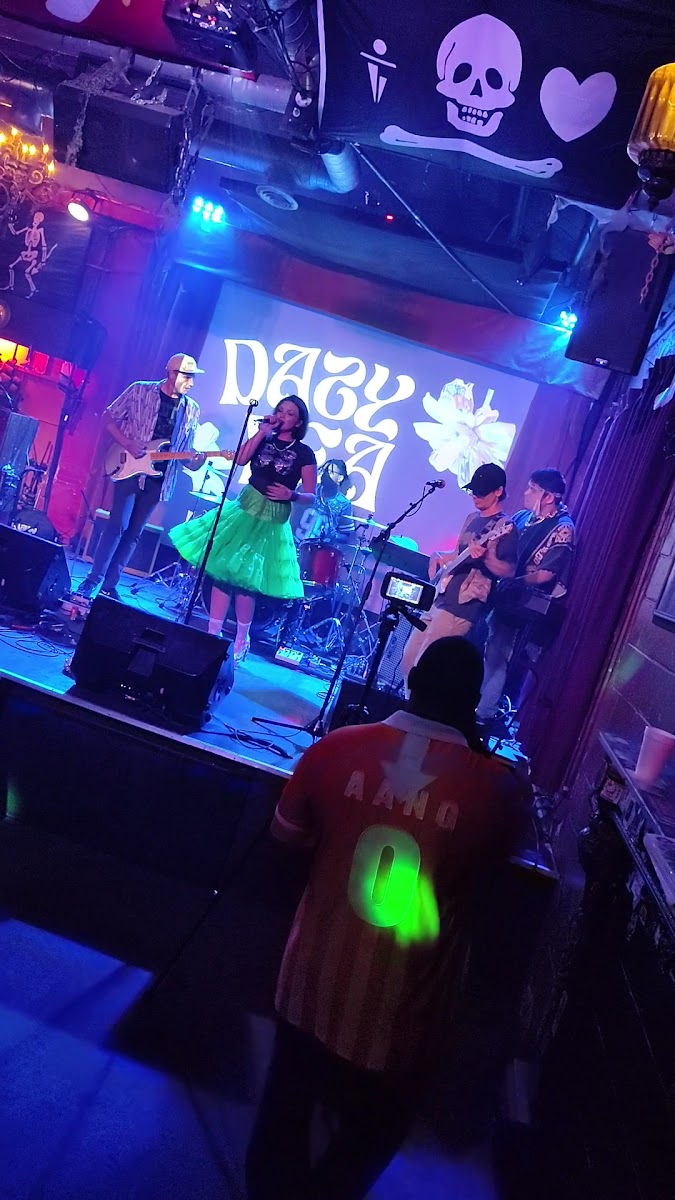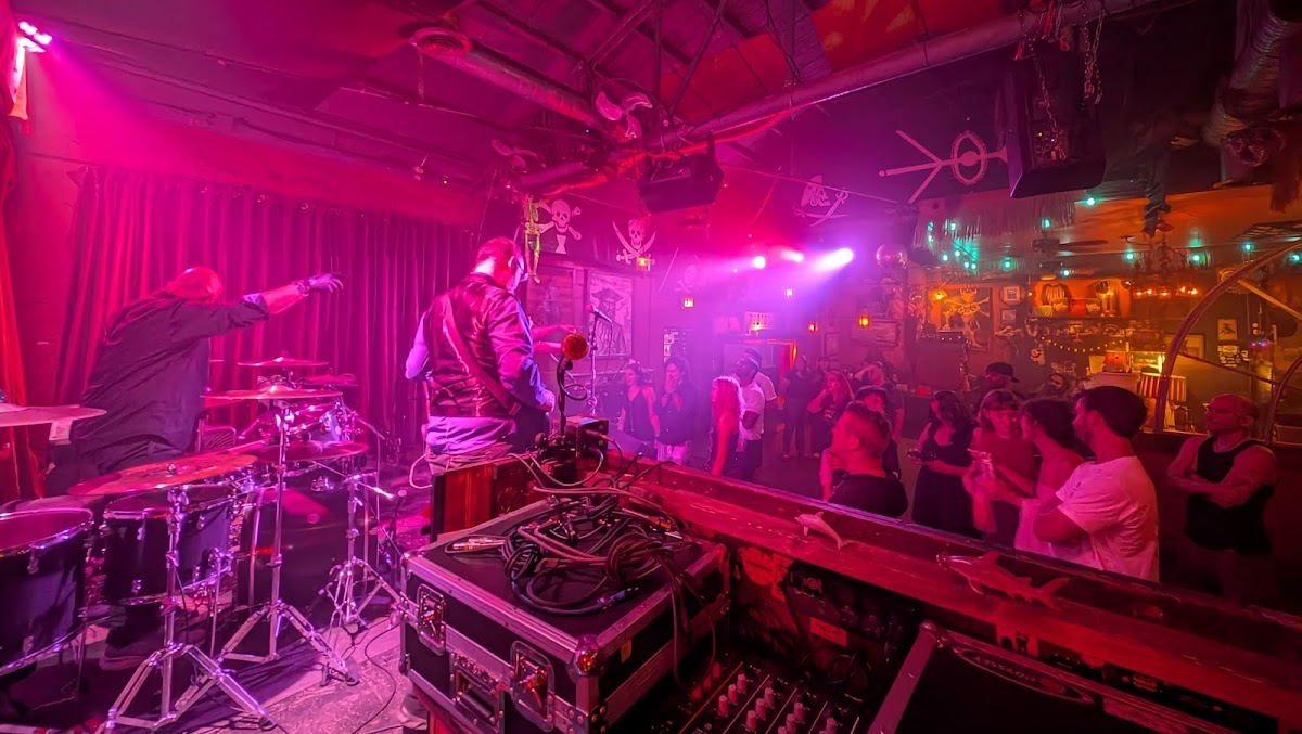 The atmosphere carries a distinct character, rooted in its pirate-themed charm and the unmistakable vibe of a neighborhood bar that knows its people. Brilliant local acts share the stage alongside touring bands, filling the space with rhythms that move through every corner — from the cozy indoor bar to the lively backyard stage, complete with games and shaded nooks that invite lingering. The sound and lighting complement each performance without overpowering the human moments happening all around.